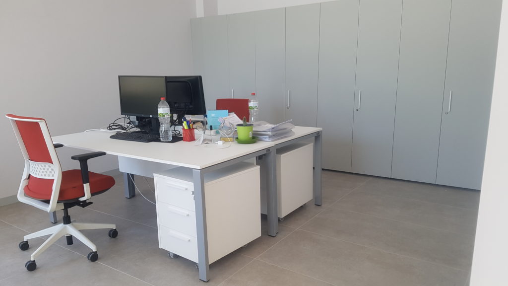 La actuación ha incluido la instalación de mesas individuales con buques de cajones con ruedas, acompañadas de conjuntos de armarios con estantes y cerradura, perfectamente integrados en las paredes para optimizar el espacio y garantizar el orden. Además, se han incorporado estores de gran formato con mando a distancia, que aportan confort y funcionalidad en el día a día.